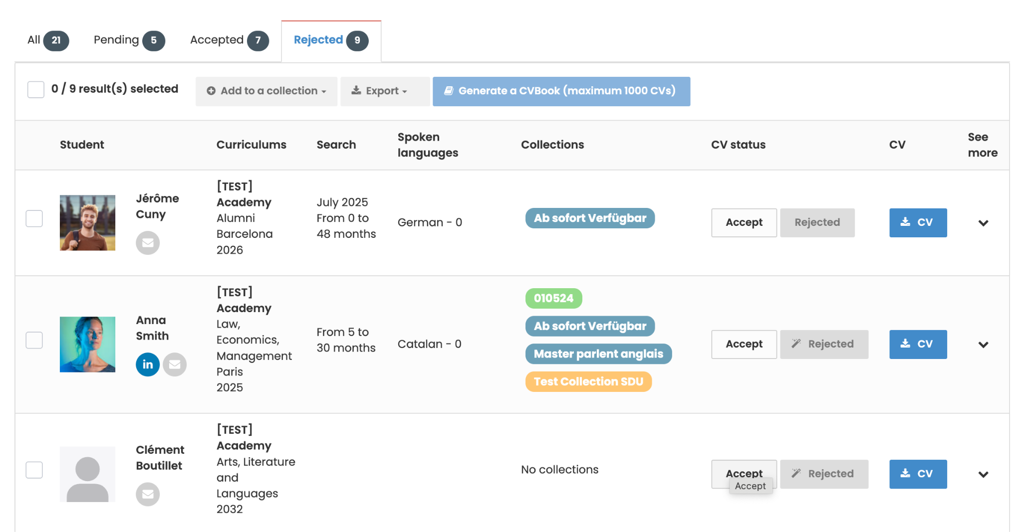 Als Administrator können Sie akzeptierte oder abgelehnte Lebensläufe im Talent-Bank-Modul Ihres Back Office einsehen. Dort haben Sie die Möglichkeit, Lebensläufe, die noch auf Validierung warten oder abgelehnt wurden, manuell zu akzeptieren, wenn Sie dies für sinnvoll halten.