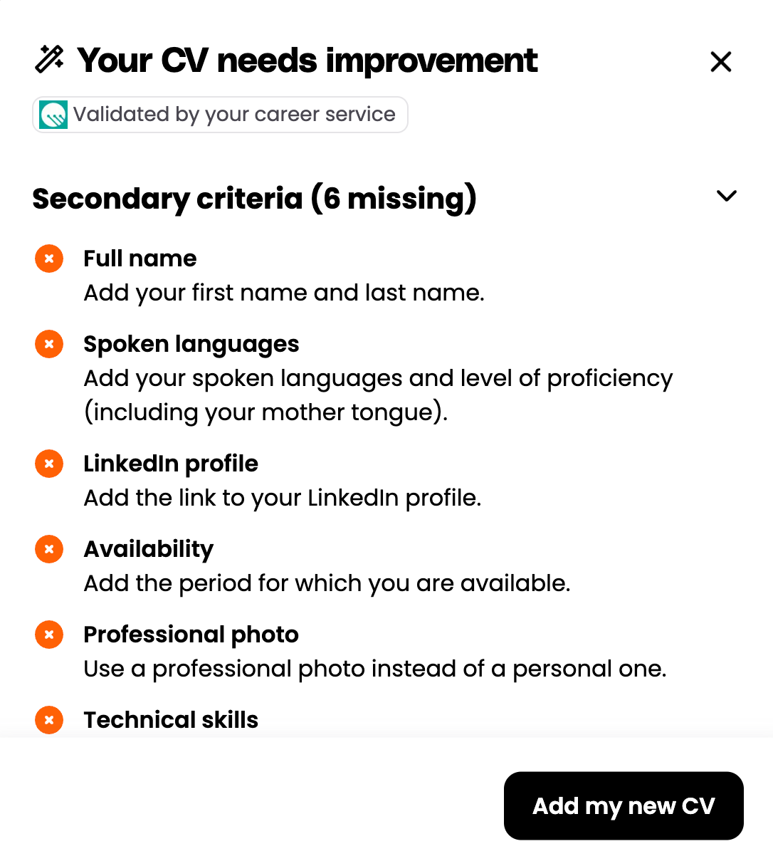 Der Lebenslauf-Checker wird automatisch aktiviert, wenn ein mit dem Studierendenprofil verknüpfter Lebenslauf hochgeladen wird. Dies umfasst mehrere Szenarien: