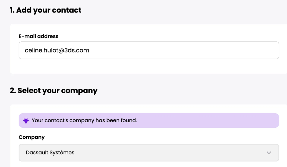 E-Mail keinem Unternehmen zugeordnet → manuell aus dem Dropdown-Menü auswählen oder über das Formular ein neues Unternehmen anfordern