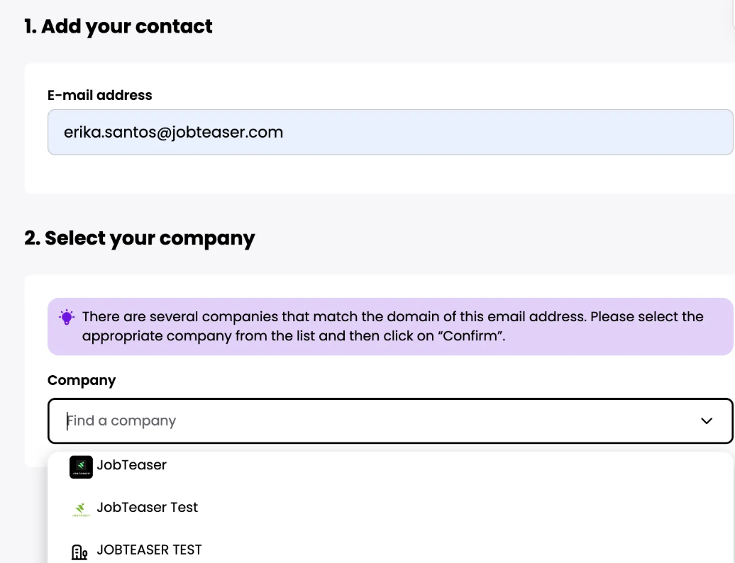 E-Mail mehreren Unternehmen zugeordnet → das entsprechende Unternehmen aus dem Dropdown-Menü auswählen und bestätigen