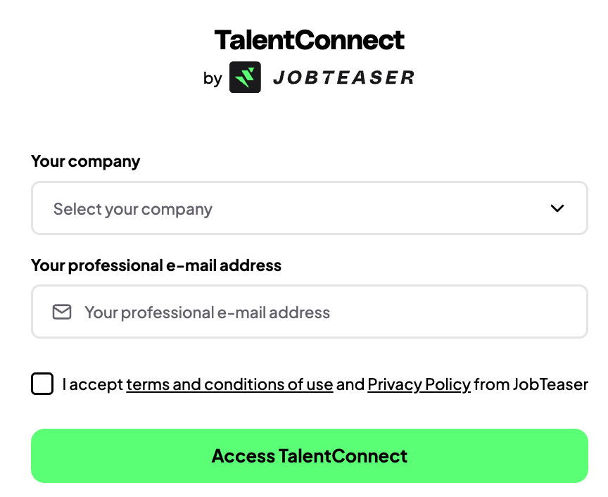 Durch Scannen des QR-Codes oder Anklicken der URL gelangen Unternehmen zur Startseite von TalentConnect. Dort werden sie aufgefordert: