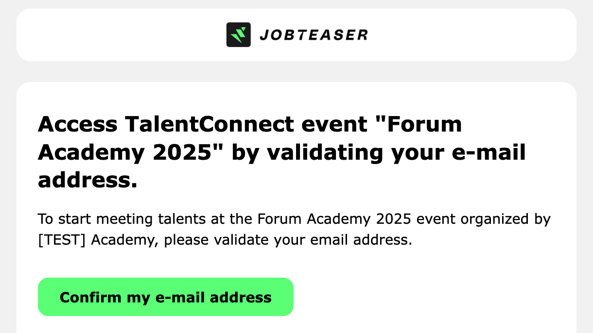 Damit sich die Unternehmen am Tag der Veranstaltung mit TalentConnect verbinden können, stellen Sie ihnen die URL und den QR-Code für den Zugriff zur Verfügung. Diese finden Sie im Reiter TalentConnect Ihres Events.