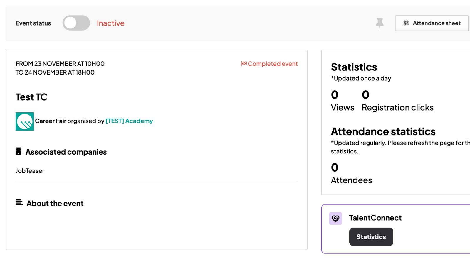 Sie können detaillierte Daten über die Leistung der Veranstaltung und die Interaktionen zwischen Studierenden und Recruitern einsehen.