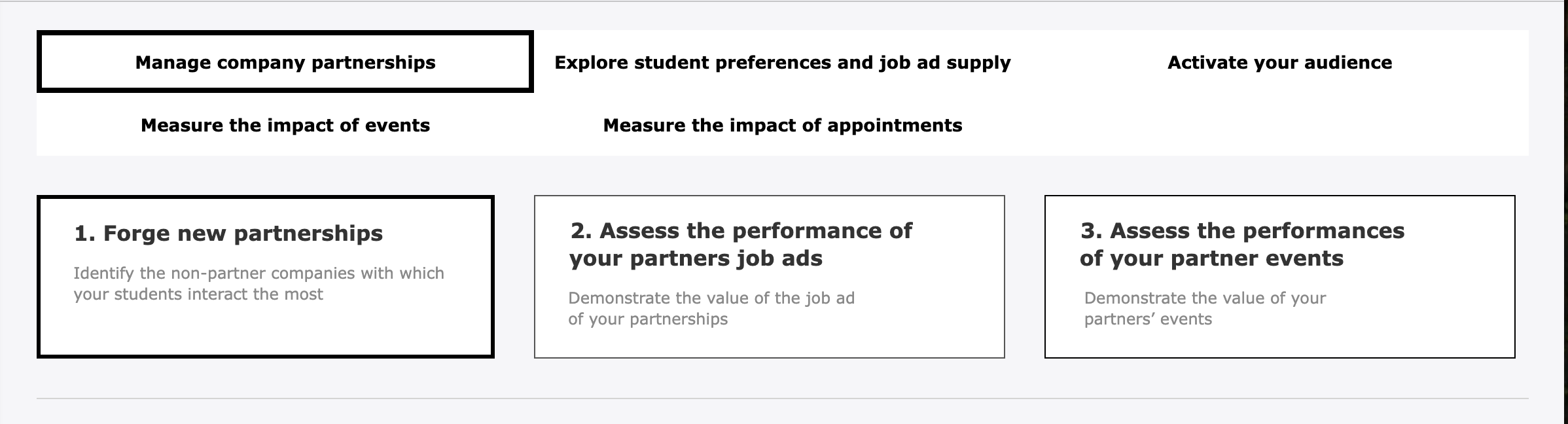 → How do the job ads, events and employer branding contents posted by my company partners perform? → Are the job ads, events and other employer branding contents posted by my company partners reaching the right audience? → Which non-partner companies have the biggest audience in my Career Center and could become future partners of my institution? |