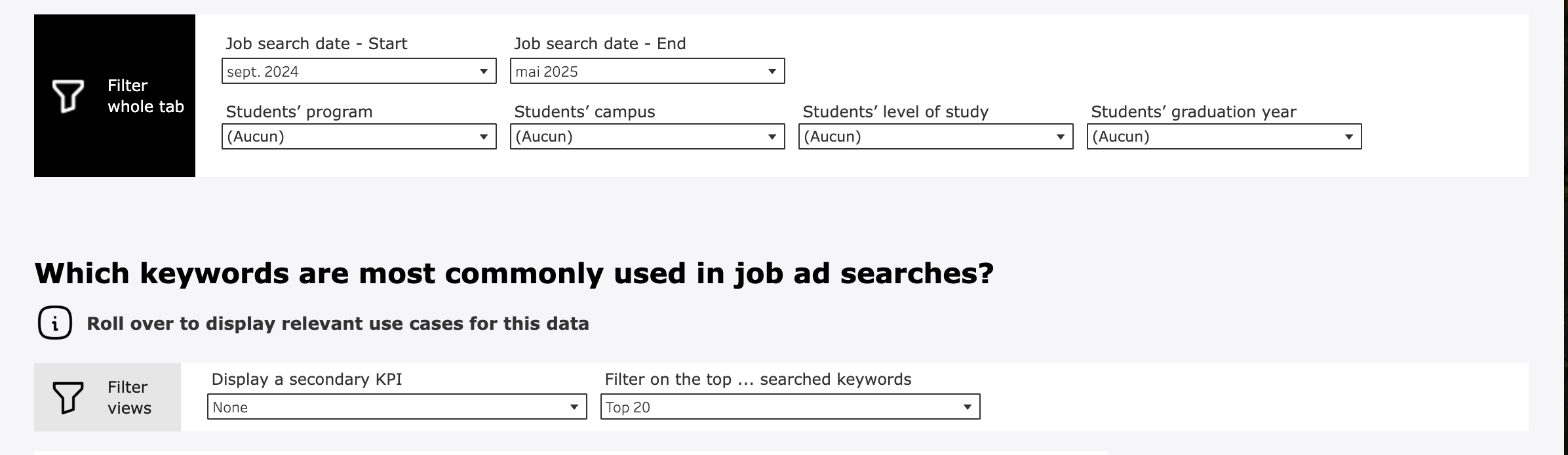 → What do the keywords searched reveal about your students’ preferences? → What are the search trends of your students? → On which functions, contract types, locations, industries, companies, etc are your students applying to? → Is there enough supply on the Career Center to address their needs? → When are students looking for jobs throughout the year? → Which types of contents are your students navigating at each time of the year? |