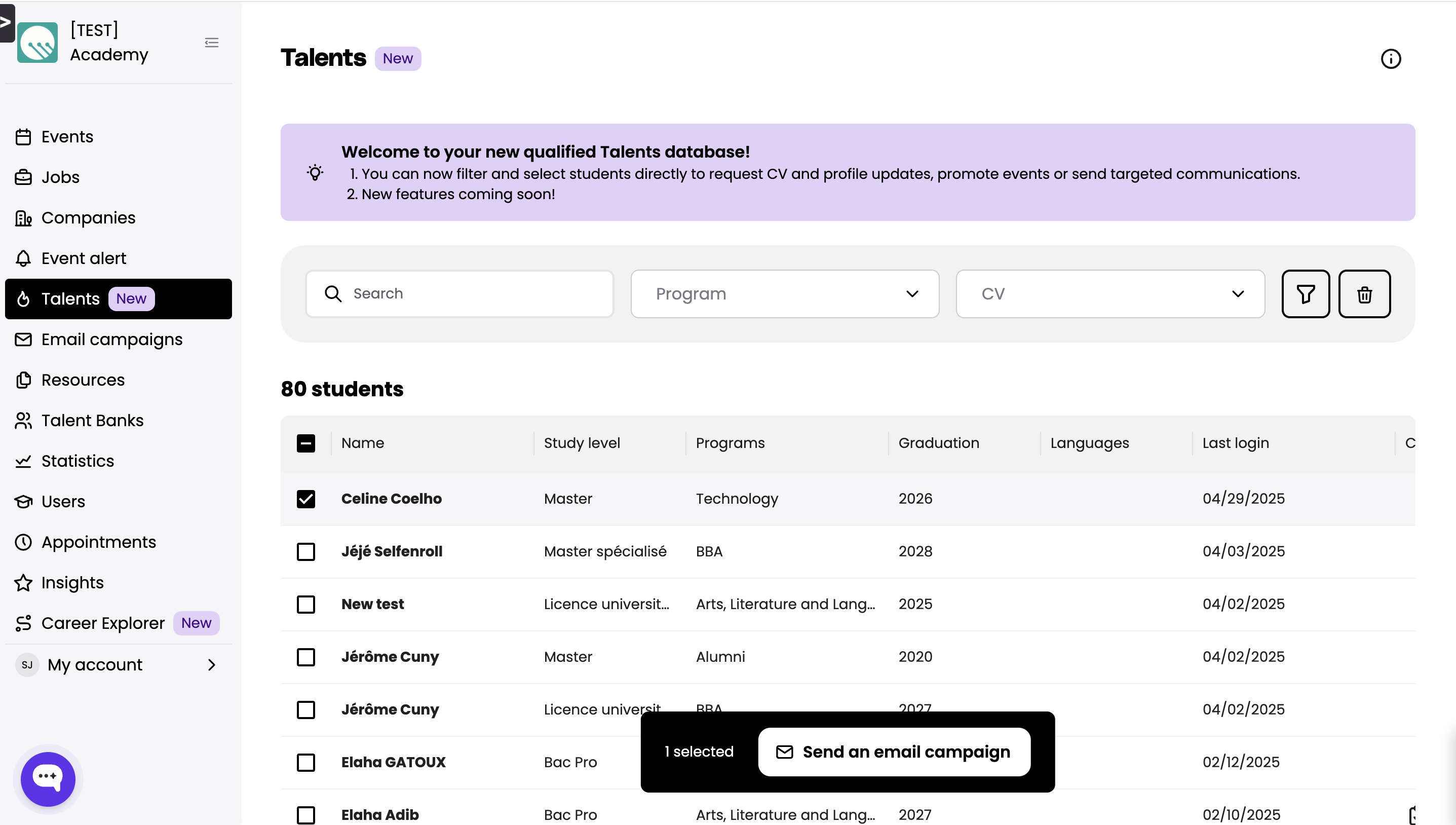 El módulo Talents es su herramienta principal para gestionar los grupos de estudiantes. Su ventaja principal es la capacidad de identificar y segmentar fácilmente grupos específicos de estudiantes mediante filtros avanzados (por ejemplo, por programa, campus o año de graduación) o mediante selección manual.