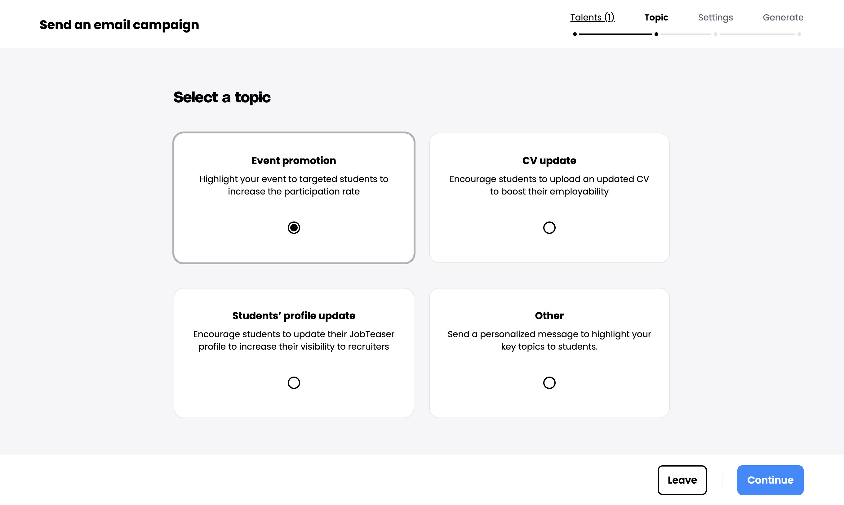 Al iniciar su campaña desde el módulo Talents en lugar de desde el módulo estándar de Campañas de correo electrónico, se asegura de que su mensaje llegue solo a la audiencia más relevante, aumentando la interacción y evitando el exceso de comunicación.