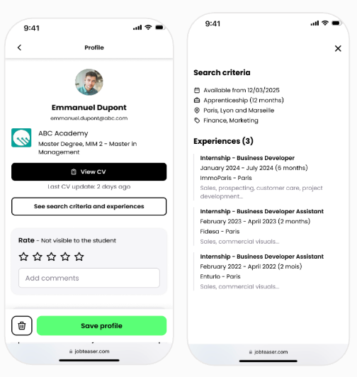 Los estudiantes reciben un correo después del evento con un resumen de sus interacciones. Incluye una lista de las empresas que han visto y guardado su perfil y se envía 24 horas después del evento. 📧