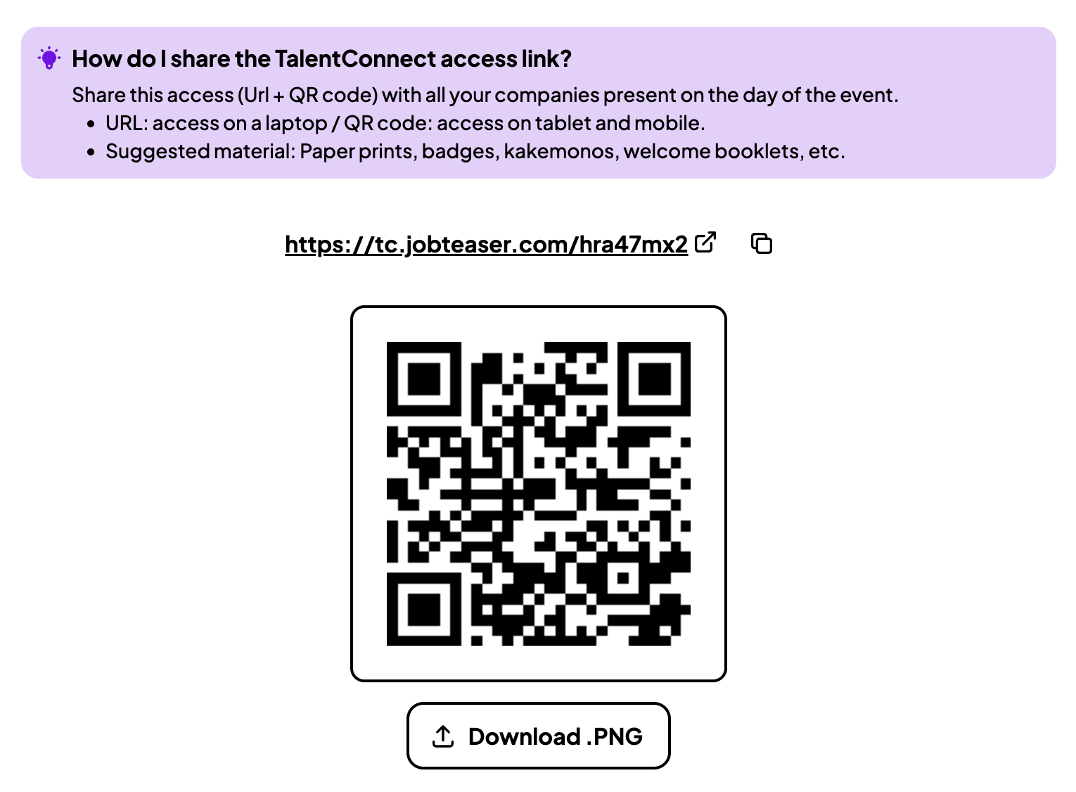 Para permitir que las empresas se conecten a TalentConnect el día del evento, proporciónales la URL y el código QR de acceso. Encontrarás ambos en la pestaña TalentConnect de tu evento.