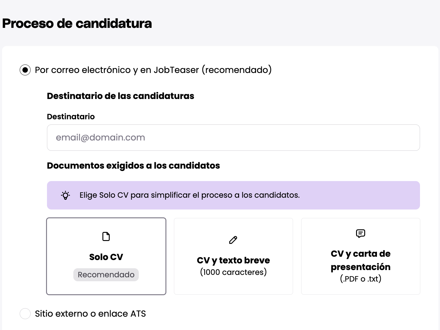 Al publicar una oferta en vuestro Career Center, el reclutador debe indicar cómo y dónde gestionar las candidaturas de la oferta: