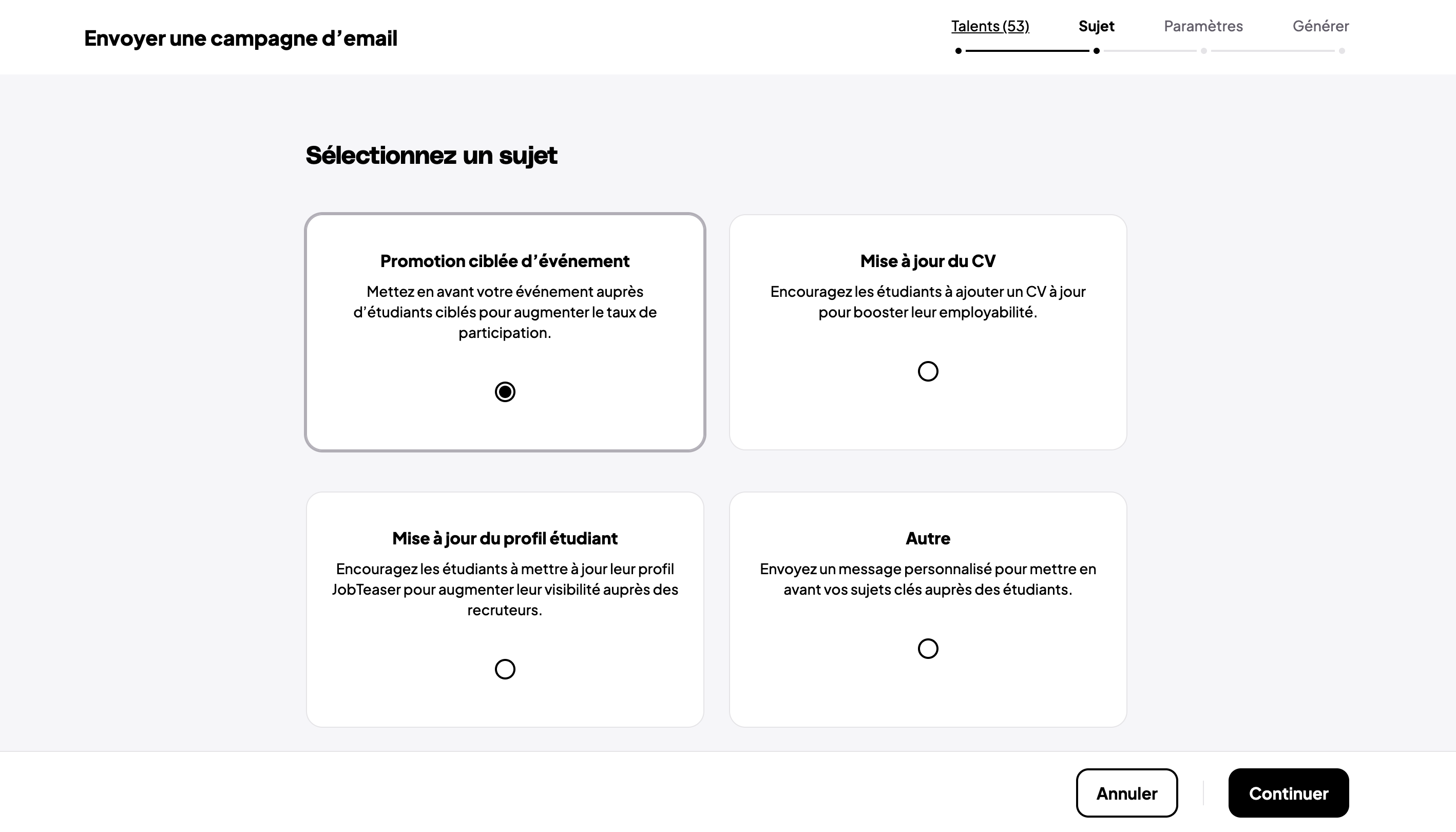 Dans cette étape, vous pouvez sélectionner le type de campagne souhaitée, dans le cadre d'une promotion d'évènement vous sélectionnerez "promotion ciblée d'évènement". Vous pourrez aussi via d'autres campagnes, encourager les étudiants à mettre à jour leur CV ou encore leur profil via nos modèles d'emails pré-définis.