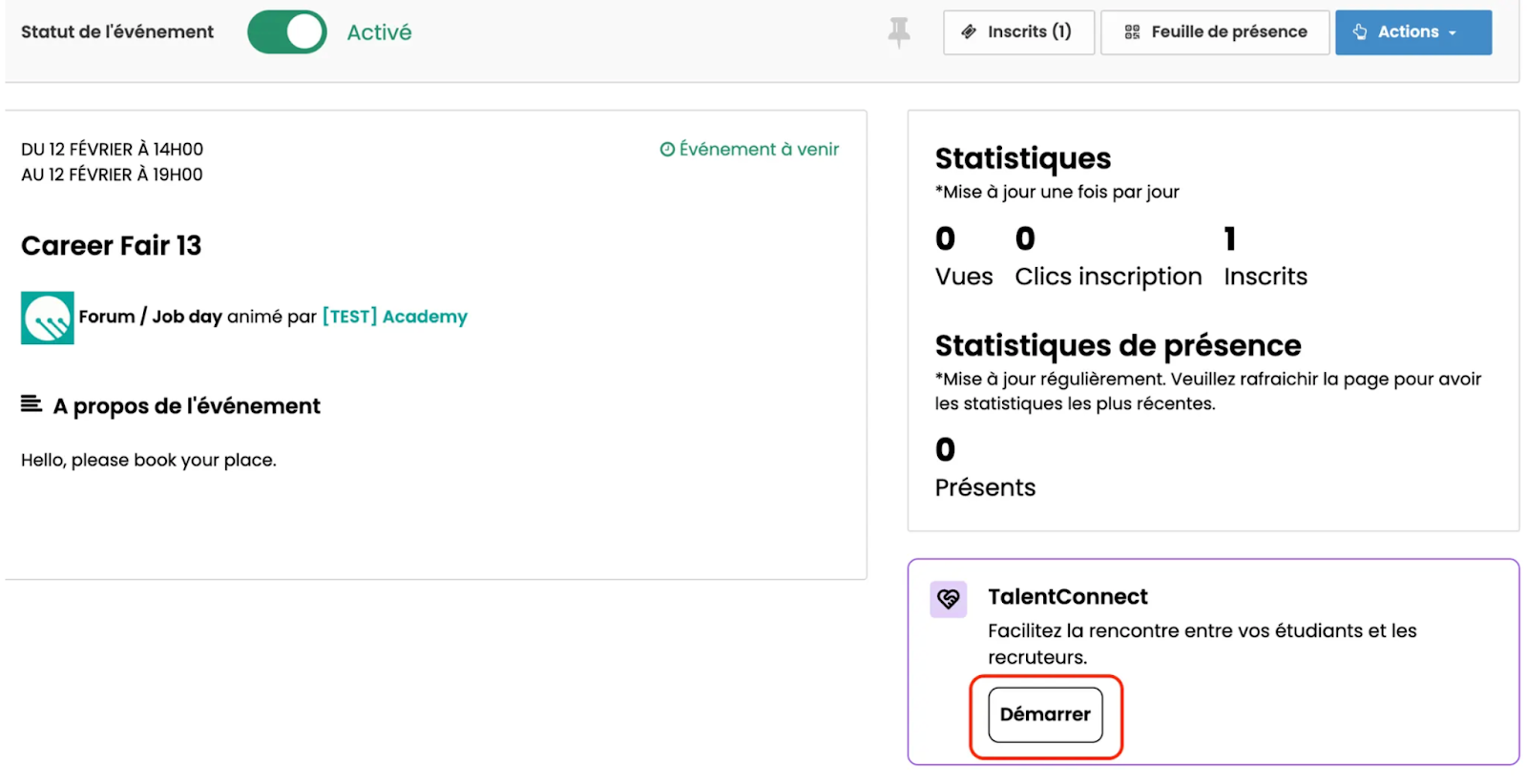 Sur la page de l’évènement, vous verrez l’onglet TalentConnect à droite de la page. Cliquez sur “Démarrer” pour l’activer.