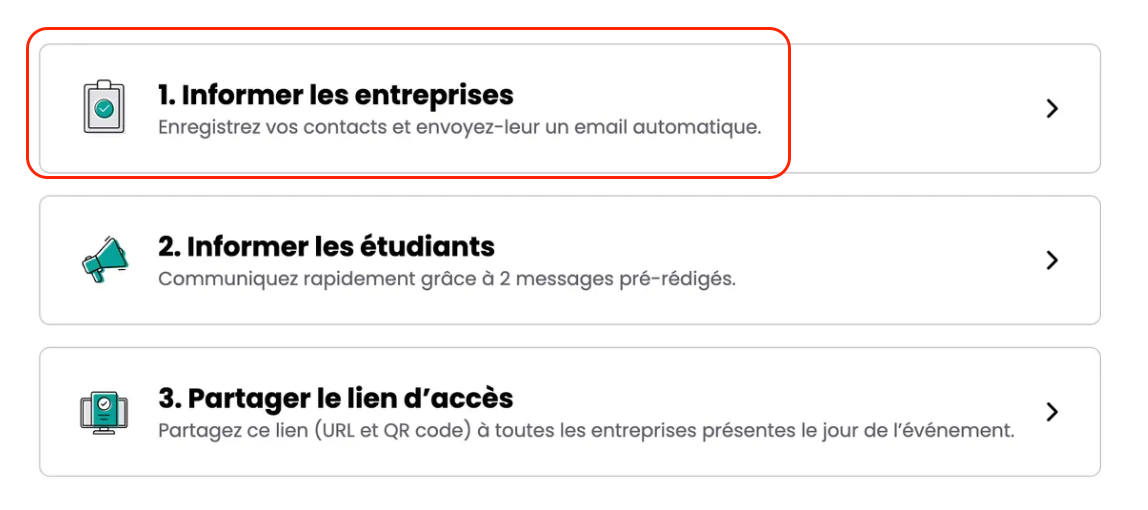 Pour donner accès aux entreprises à TalentConnect, cliquez sur l'onglet TalentConnect, étape 1 Informer les entreprises. 📬