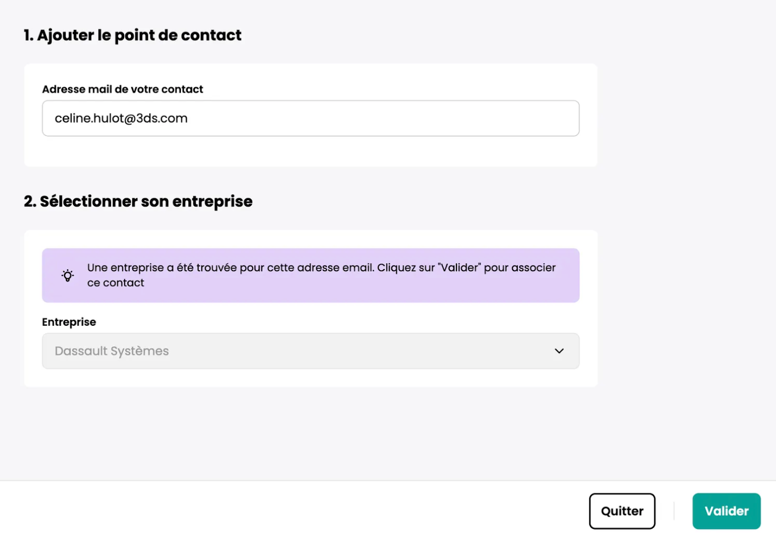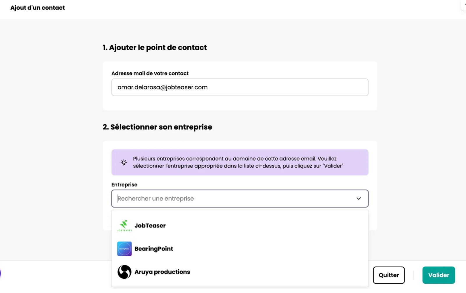 ⚠️ L’adresse mail du contact est associée à plusieurs entreprises, il convient alors de sélectionner l’entreprise correspondante dans le menu déroulant, et de valider le point de contact.