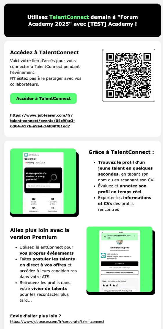 ➡️ Une fois le paramétrage finalisé, la prochaine étape est de bien communiquer auprès de vos étudiants et des entreprises. Cette étape est essentielle pour assurer le succès de TalentConnect lors de votre événement. C'est ce que vous pouvez voir dans les autres articles sur Talent Connect .