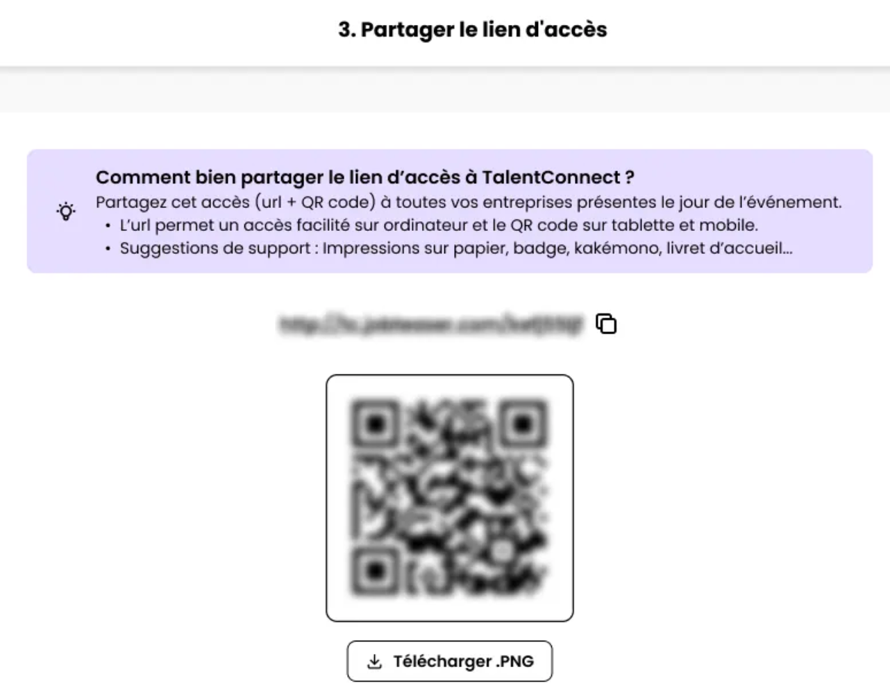 Afin que les entreprises puissent se connecter à TalentConnect le jour-J, mettez à leur disposition l’URL et le QR code d’accès. Vous les retrouverez dans l’onglet TalentConnect de votre événement 🔗📱 :
