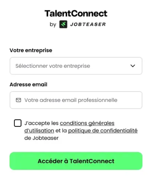 En scannant le QR code ou en cliquant sur l’URL, les entreprises arriveront sur la page d’accueil de TalentConnect. La page d’accès à TalentConnect lui demandera simplement de :